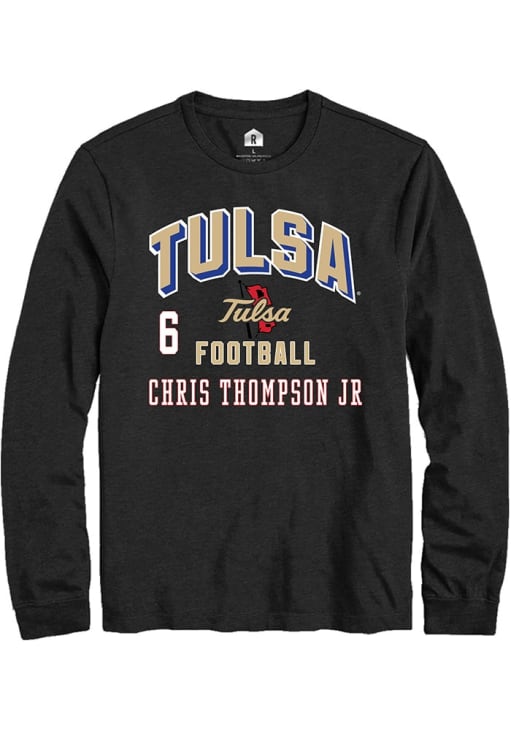 Embrace the spirit of your favorite player in this Tulsa Golden Hurricane Black Football NIL Arch Logo Chris Thompson Jr Long Sleeve Player Tee! This Player T Shirt features a NIL graphic, so everyone will know you cheer for Tulsa, Chris Thompson Jr! This is the perfect Golden Hurricanes Player Tee for game days. Go Hurrianes!