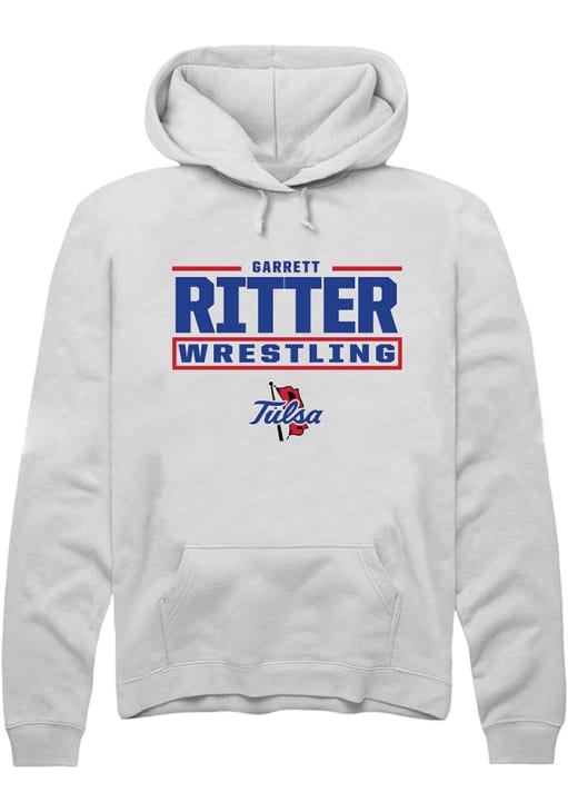 Garrett Ritter Rally Mens White Tulsa Golden Hurricane NIL Stacked Box Hooded Sweatshirt