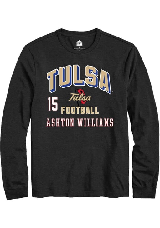 Show your Tulsa Golden Hurricane spirit in this Tulsa Black T Shirt! This Tulsa Football NIL Arch Logo Long Sleeve T Shirt makes a great layer for cooler nights cheering on the Golden Hurricanes. Featuring a custom graphic with player's name and number, this Tulsa Golden Hurricane Long Sleeve Tee is an essential addition for every fan. Go Hurrianes!